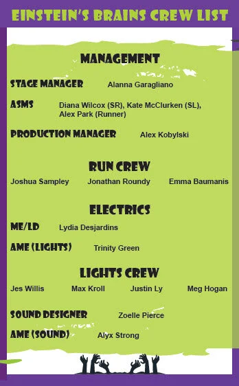 (Scenic Crew), is a freshman here at WSHS and Einstein's Brains is her very first show to be working on and it was an incredible first experience. She had a lot of fun and hopes to work on more shows in the future. She would like to thank Ms.Nash for letting her be a part of it all, Anna for putting up with the set group, and everyone else in set group for dealing with her weirdness.
