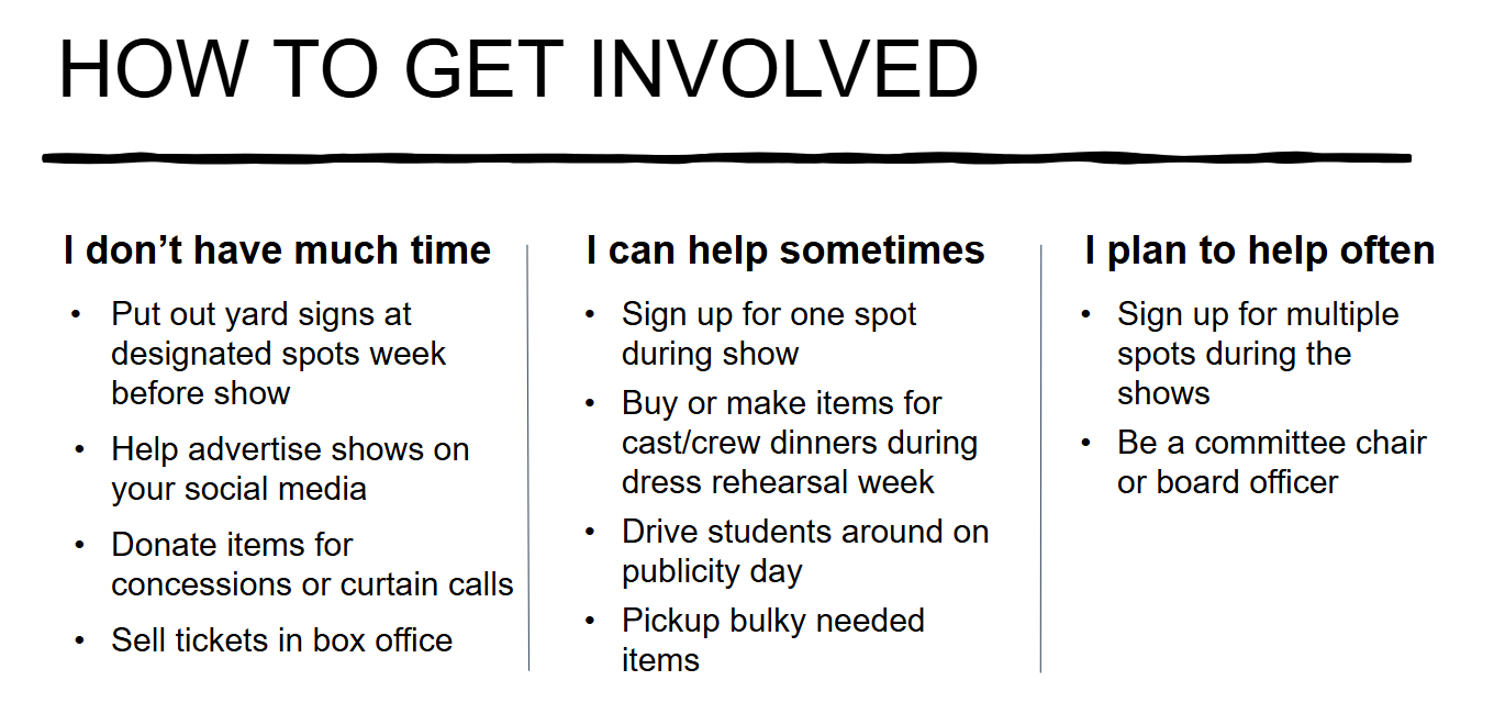 There are so many ways to get involved with Theatre Boosters (aka TAP). From donating items or funds to donating time. We understand not everyone has a ton of time to offer, but don’t worry - there are a variety of commitment levels available.